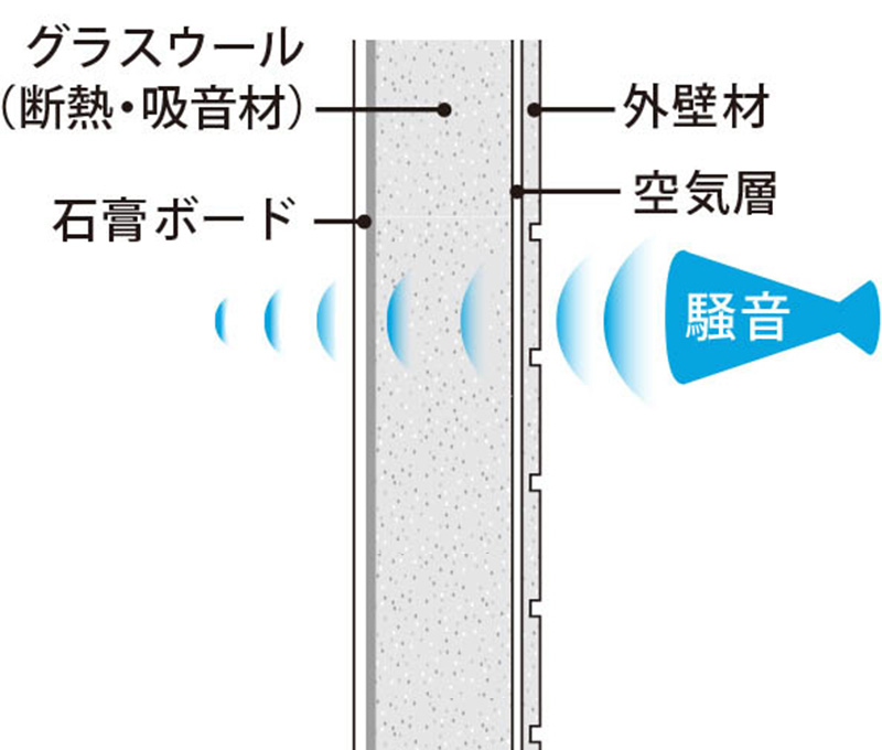 外壁材と石膏ボードが低音域の騒音を遮り、グラスウールが中音域の音を吸収。