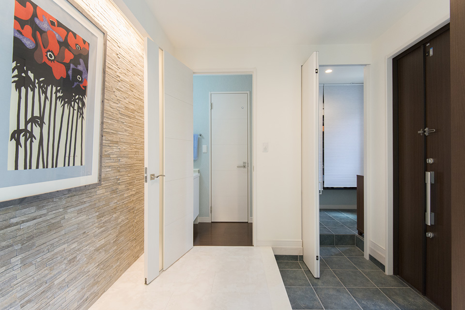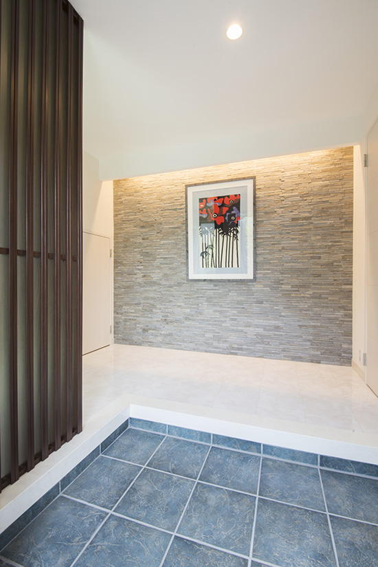 玄関を入ると、正面に飾られた木版画が目をひきます。壁に張られたスティックタイルは、光があたると陰影が美しく、お気に入りです。左手の格子は、玄関を入ったお客様の視線をまず正面の壁に集めるためのもの。おもてなしの工夫がなされたギャラリーのような玄関です。