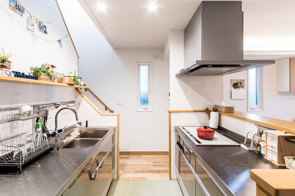 ふたりでも料理がしやすいように2列型のキッチンを選びました。キッチン裏の階段からの採光を計算して、あえてシンクはLDK側でなく壁側へ配置。ステンレスのスタイリッシュなキッチンは、お手入れがしやすく、ぐんと家事がラクなりました。