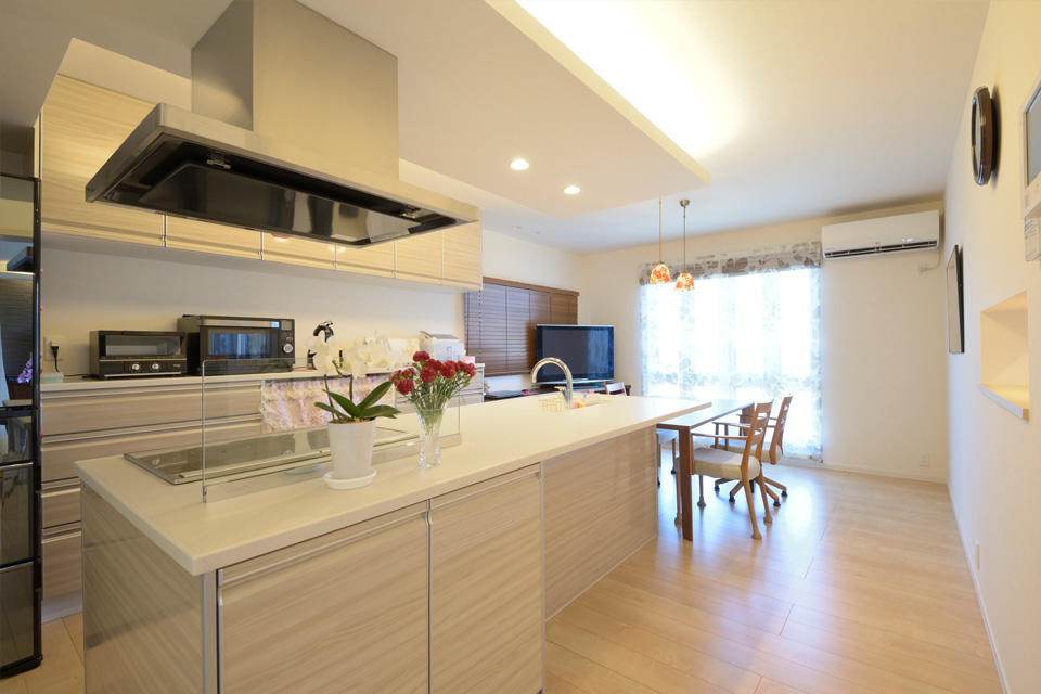 大きなアイランドキッチンが目をみはるダイニングキッチン。空間はナチュラルな色彩で品よくまとめられ、とても居心地がいいそうです。そのおかげで食事の時間以外も、ご家族の憩いの場所になっているそうです。