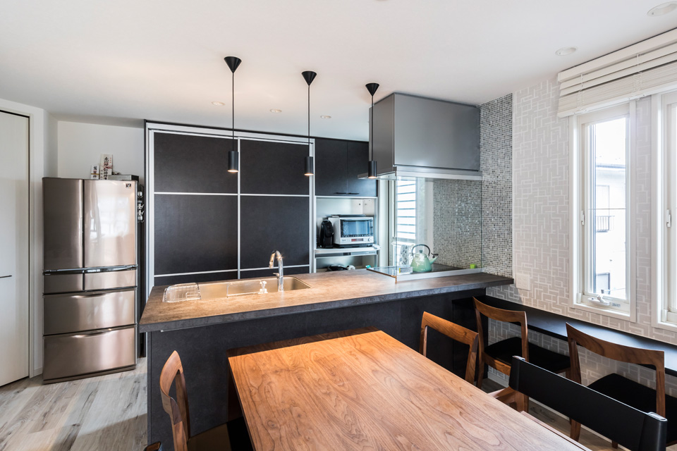 「セラミック天板の広い調理台に、大満足!」という奥様が、ショールームで一目惚れしたというキッチン。このキッチンの雰囲気にあわせてダイニングも統一したというくらい。