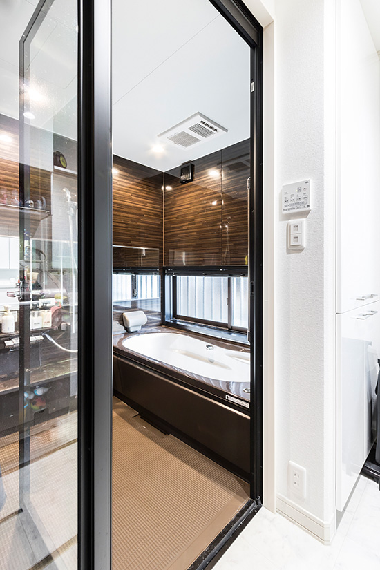 ダーク系の色味でまとめた浴室は、落ち着いた印象に。空間を広く見せるために、ガラス扉を採用。「息子がひとりでお風呂で遊ぶときもありますが、洗面室から見えるので安心です」とS様。
