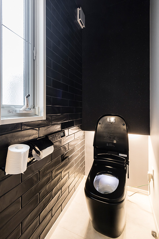 2階のトイレは、便器や壁面、収納まですべて黒で統一し、モダンな印象に仕上げました。タンクレスの便器を後ろから間接照明で照らす演出が非日常感を与えます。ひとつずつ丁寧に、ご主人がこだわって選びました。