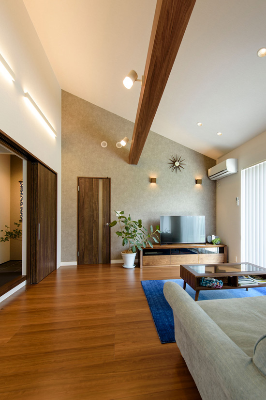 傾斜天井が広がりを感じさせる空間に、壁いっぱいの大きな窓から、たっぷり陽が降り注ぎます。お気に入りのリビングです。