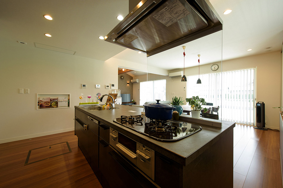 ご夫婦そろって料理をすることも多いのでアイランドキッチンを選びました。リビングもダイニングも見渡せるので家族の気配が感じられて子育てしながらの家事も安心。