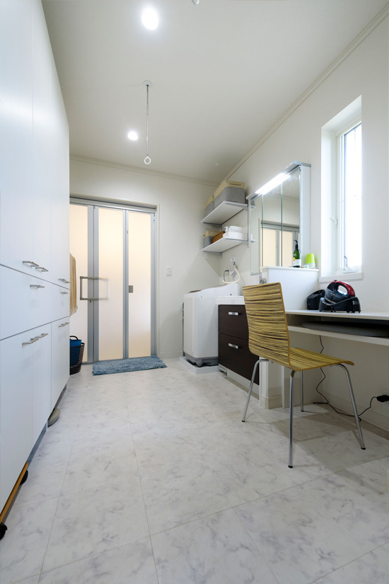 洗面脱衣室は収納を充実させました。洗濯物をアイロンした後、収納まで、一連の家事がここで完結。ちょっとした動線の工夫が、家事がおおいにラクにしてくれるそう。