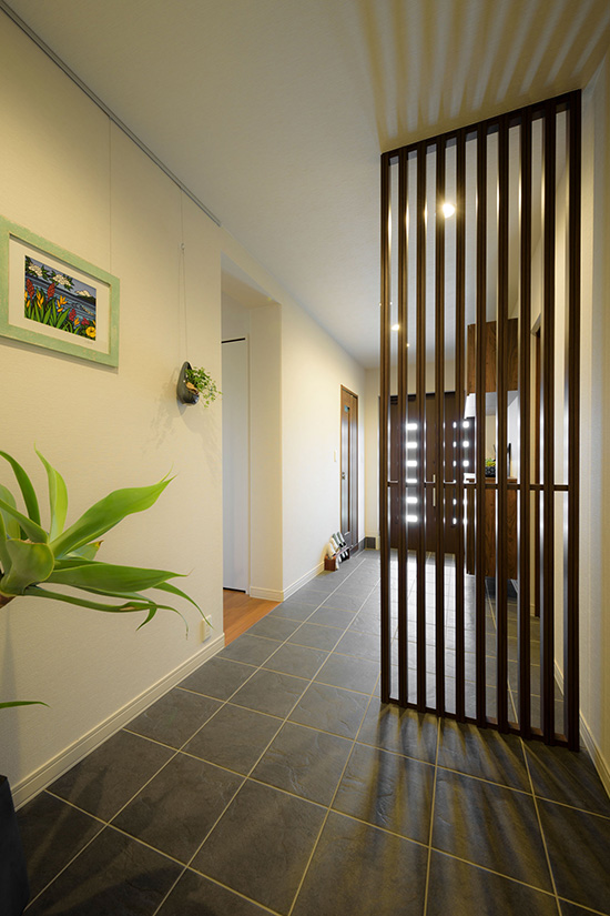 玄関から続くタイル貼りの廊下。玄関扉のガラスを通して光が入り日中はいつも明るく開放的です。格子の間仕切りを通してできる影が印象的な空間に。