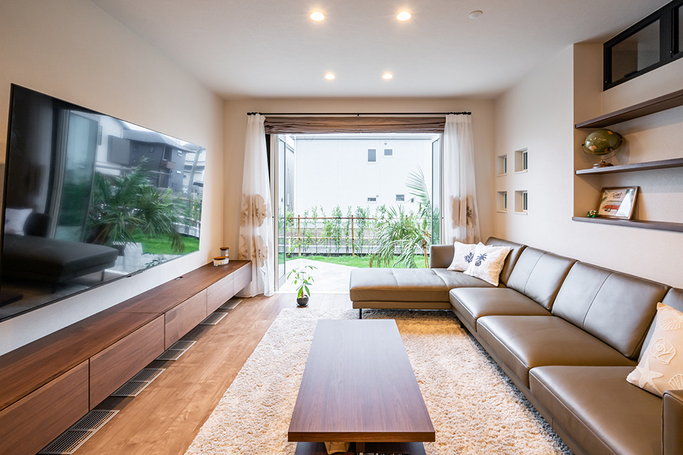 「快適だし、家にいるだけで幸せ」という奥様。リビングで映画鑑賞をしたり、庭の草花の手入れをしたりと、ご夫婦でおうち時間を楽しんでおられます。