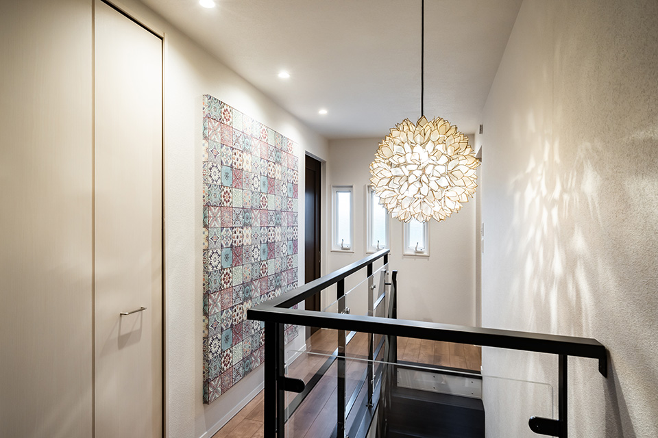 絵画のようにクロスを貼った壁が映える階段ホール。繊細な光を放つ貝殻の照明によって、さらに印象的な空間を演出します。