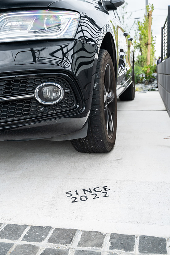 駐車場の床面に埋め込んだ、「SINCE 2022」の文字がよいアクセントに