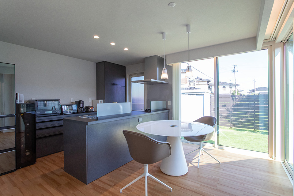 「ここで朝食を食べると1日を気持ちよくスタートできる」という、朝日が差し込む東向きのダイニング。キッチンやダイニングからは庭とリビングが見渡せ、明るく開放感のある空間となりました。キッチンまわりをダークトーンで統一したことで、生活感が少ないモダンな印象に。食器や食料品のストックなどをゆとりをもって納められる収納を設けるなど、使い勝手も考えられています。