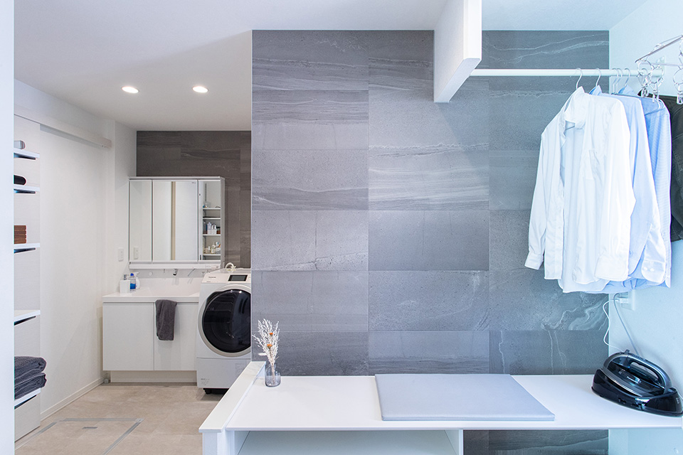 洗濯から室内干し、アイロンがけまでできる洗面脱衣室。キッチンと洗面脱衣室の距離を近くすることで、水回りの家事動線をコンパクトに。暮らしやすさを考えた設計で、家事時間をスマートに短縮します。調湿機能のある壁材や、快適エアリーのおかげで、湿気がこもりにくく、さわやかに過ごせるそうです。