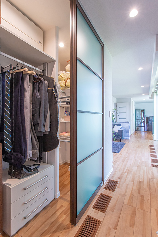 ウォークインクローゼットは、玄関ホールからリビングへの動線上に配置。帰宅後すぐにスーツやかばんなど、仕事関係の衣類をしまうことができます。反対側の引き戸をあけると、布団やスーツケースなども収納できるスペースも。
