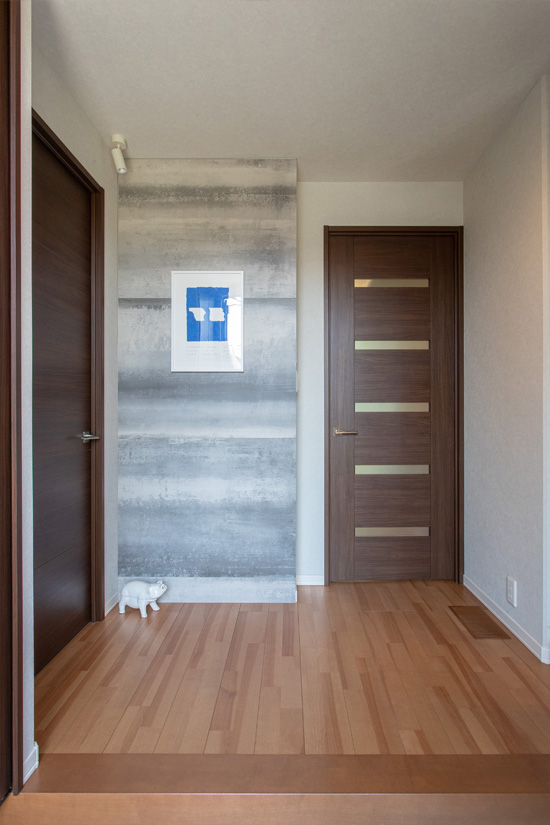 壁のタイルが印象的な玄関ホール。リビングの壁面と同じタイルを使うことで、インテリアに統一感が生まれています。ご夫婦の靴だけではなく、さまざまな日用品が入る玄関収納を左右に設置。しまいやすく取り出しやすいので、無理なく整理整頓できます。