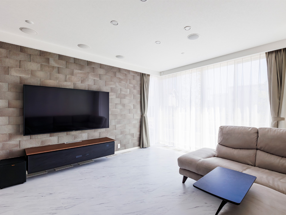 天井まであるコーナー窓からたっぷりと光が差し込む明るいリビング。「前が公園で遮るものがないのでとても開放感があります」とY様。夜は凹凸感のあるエコカラットに間接照明の光が当たって美しい陰影が生まれ、リビングの表情の変化を楽しめます。映画好きなご主人はこだわって7.1chを導入。大きなソファでゆったりと映画を見ながら、至福の時を過ごされています。