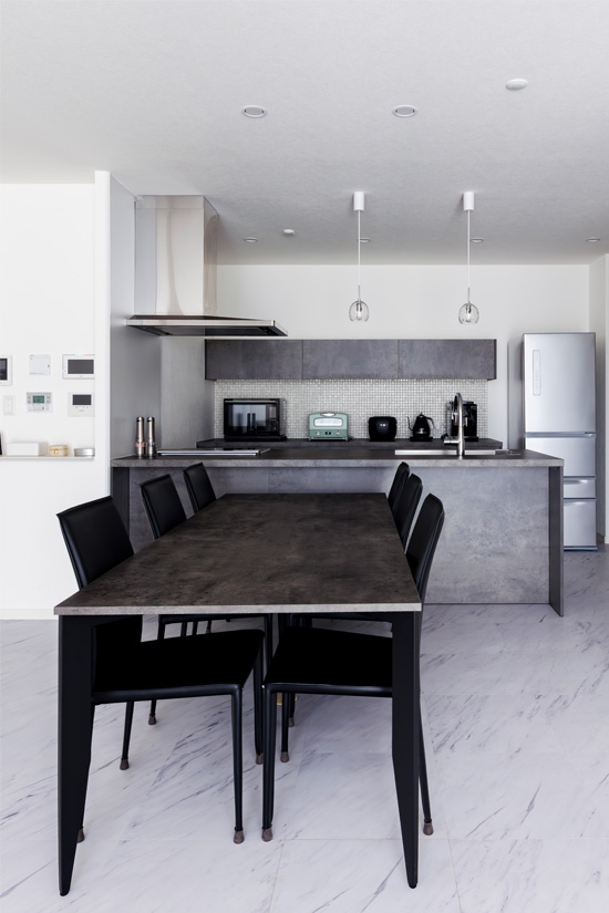 「かっこいいキッチンにしたかった」と奥様が言う黒のキッチン。ダイニングテーブルも同じメーカーの製品を選択し、統一感のあるスタイリッシュな空間に仕上がりました。収納スペースも大容量で片付けがしやすく、ストレスも少ないそう。
