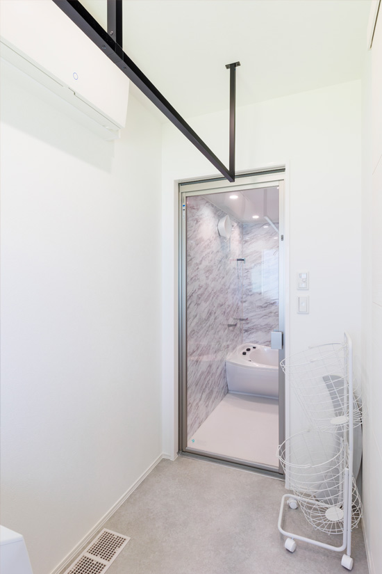脱衣室は室内干し空間としても活用。洗濯乾燥機で乾燥できないものは物干しレールに掛けているそう。床は水と汚れに強い素材を選んでいます。「濡れた衣類で重くなった洗濯物を、別の場所へ運ばなくてよいので家事の負担が減って楽になった」と奥様。