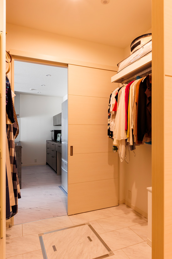 洗面室とキッチンを結ぶ動線上にファミリークローゼットを設置。帰宅後に手を洗い、服を着替えてからLDKへ向かうことができるので、室内に汚れを持ち込みにくい動線です。水まわりは引き戸を採用。戸を開けたままにしておけば、手がふさがっている時でもスムーズに出入りすることができます。