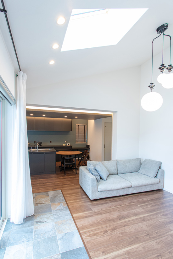 切妻屋根の形状をいかした、おおらかな勾配天井が特徴的なリビング。T様のもっともお気に入りの空間です。天窓からたっぷり差し込む自然光が部屋を明るくやわらかに照らし、より一層のびやかな気持ちを感じられます。