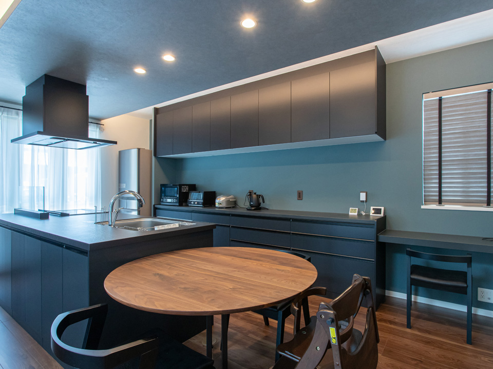 リビングとは対照的な、シックな色遣いのダイニングキッチン。食料品のストックなどもたっぷり収まる大容量のカウンター収納を備え、生活感を排した空間に。下がり天井と間接照明が、開放感を損なわずにリビングとゆるやかにゾーニングします。備え付けのカウンターデスクは、ちょっとした書き物に便利。
