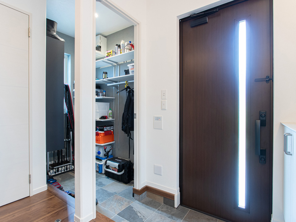 玄関からつながる土間収納。靴だけでなく、防寒着や園芸用品、Tさんの趣味の釣り道具など、濡れたり汚れたりしているアイテムも気にせずたっぷり収納できる。普段は扉を閉めておけば玄関側から見えず、来客時もすっきり。