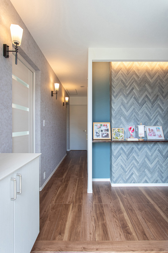 玄関へ入ると一番最初に目に入る、ヘリンボーン調のクロスと間接照明が印象的な玄関ホール。備え付けの棚には、家族の思い出をディスプレイ。