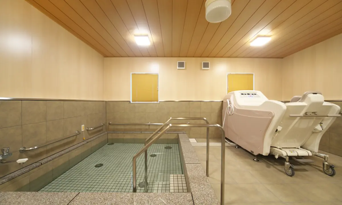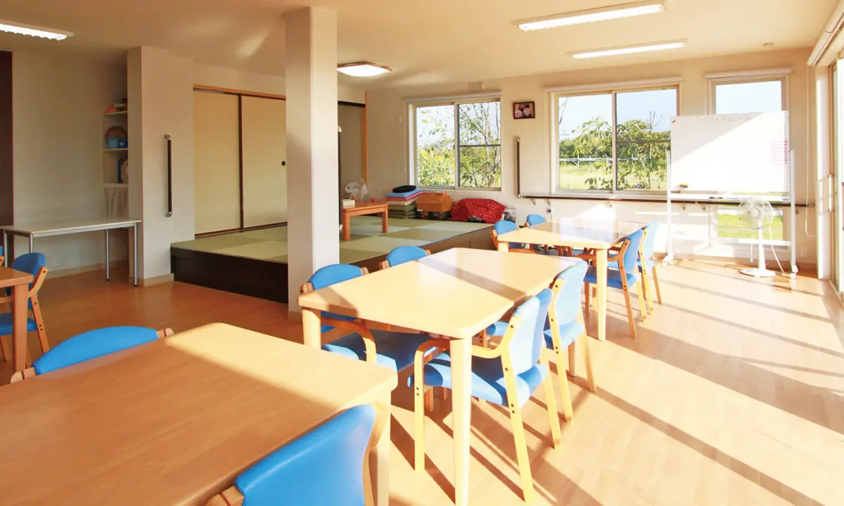 海辺の情景を連想させるエントランスのシェードと、大きな窓で明るく開放的な雰囲気が特徴的なデイサービス。玄関ホール横に洗面所を設置したり、浴室横に脱衣コーナーを設けるなど、衛生面や動線にもしっかり配慮しています。