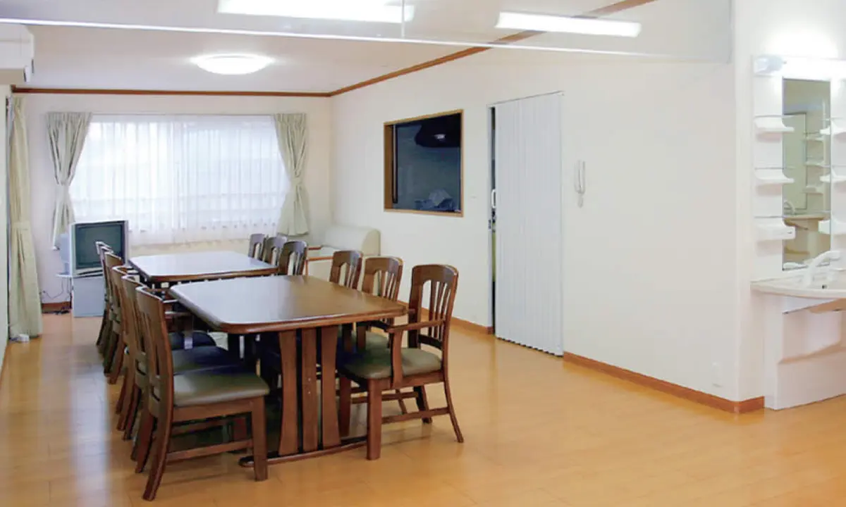 ご入居者さまが集い、訪ねて来られたご家族とのだんらんの時間が楽しめる共用スペース。1階のけやきダイニングは、二面採光を採用しており光あふれる空間が広がります。
