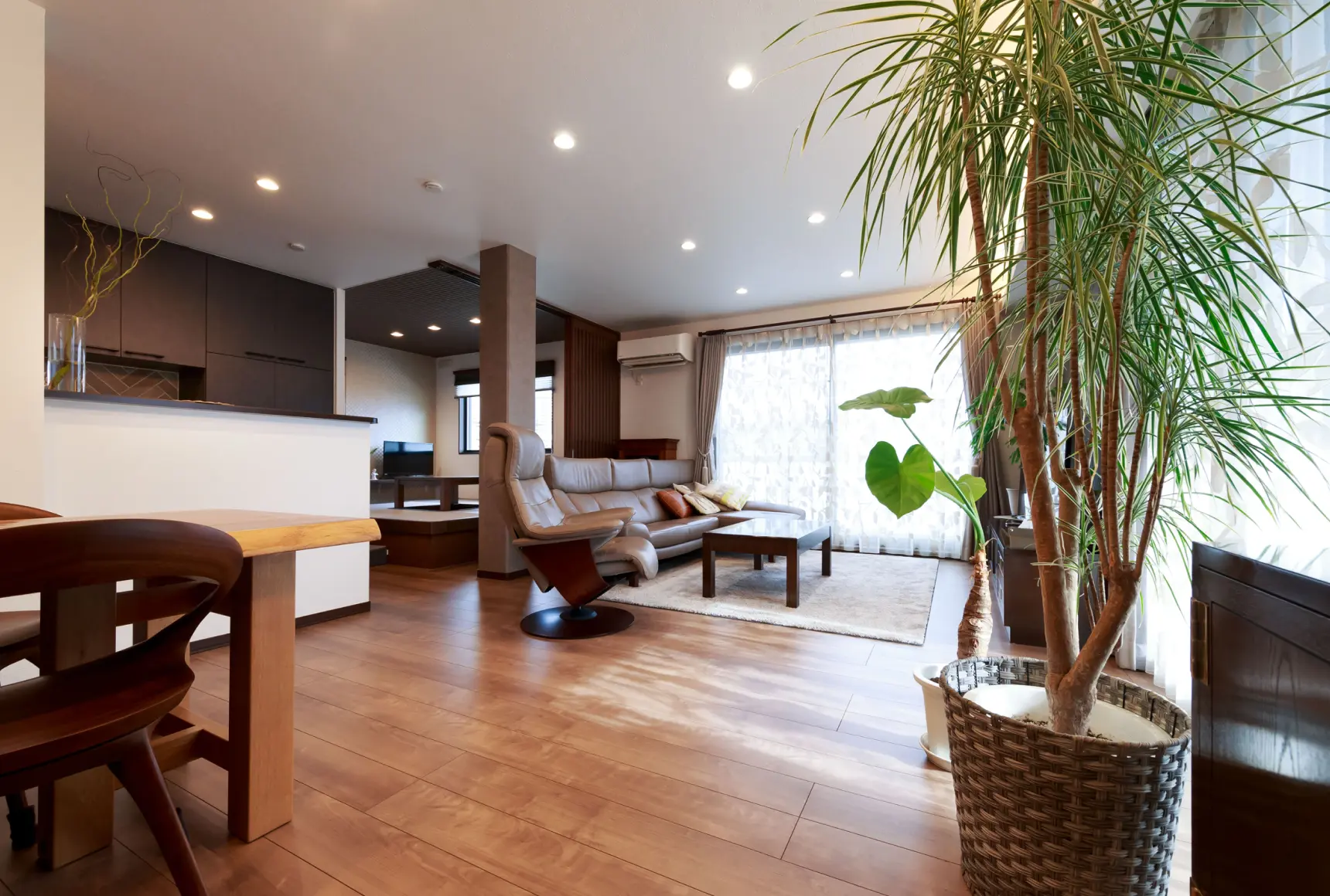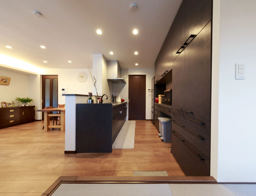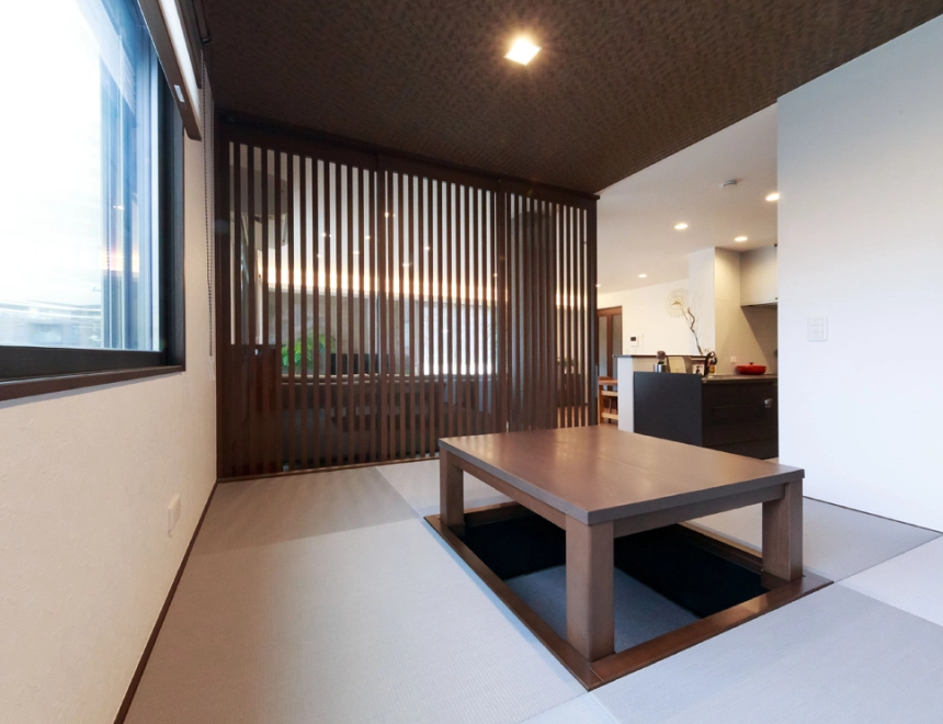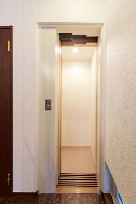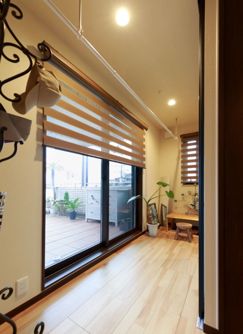 賃貸併用住宅であっても生活の質を落としたくなかったので最上階に住まい、日当たりと眺望を確保。玄関からすぐ乗れるエレベーターは重い荷物を運ぶのに役立ちます。LDKを中心に、雨でも洗濯物を干せる軒の深いバルコニーとルームコート、通り抜けができるクローゼットによる回遊動線は、ワンフロアで効率的な家事を求める奥様のこだわり。ご家族皆様の総意で取り入れた掘りごたつは家族が集う、お気に入りスぺースになりました。