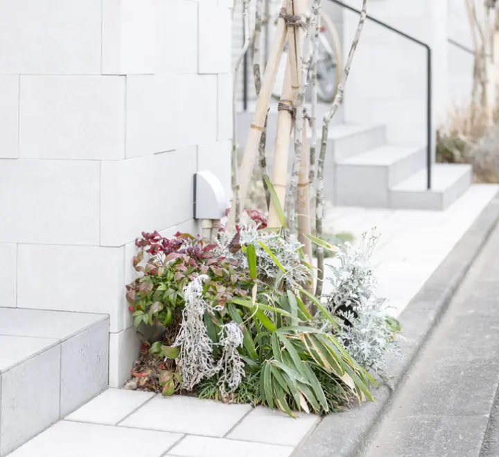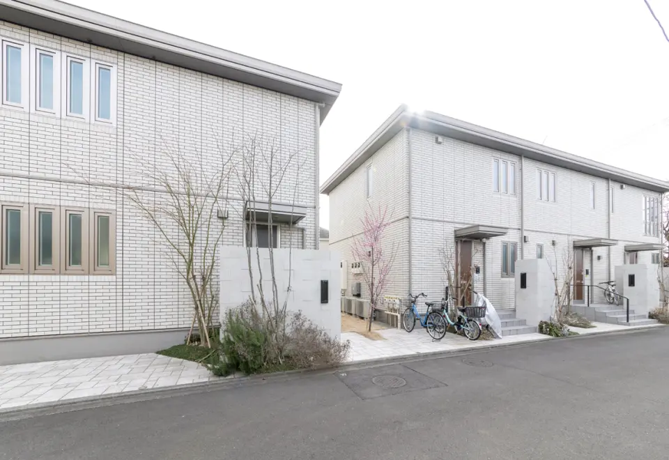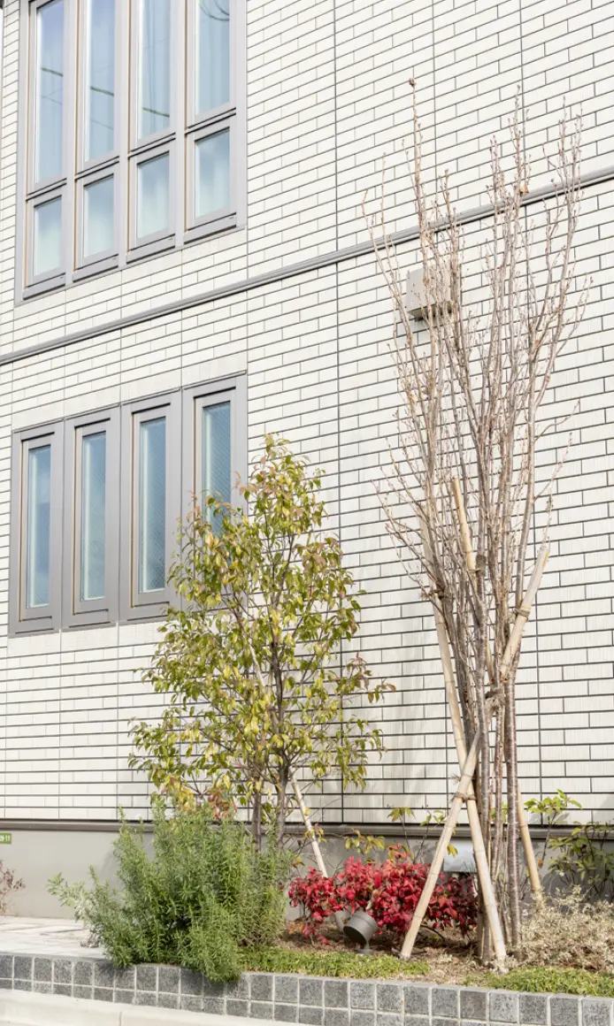 それぞれの住戸に、四季を感じる樹木である“桜”、“桃”、“楓”、“柊”と名前を付け、シンボルツリーとしてエントランスにそれぞれの樹木を植えるなど美しさと季節を楽しむためのこだわりの設計としました。戸建てを思わせる佇まいはターゲットのファミリー層に人気の物件に。さらに将来を考えて2棟に分けて1棟を売却しやすい一戸建てメゾネットにしたのも営業担当の助言を受けてのこだわりポイントです。