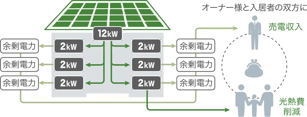 (入居者は各住戸にて発電電力を使用。オーナー様は各住戸の余剰電力を売電)