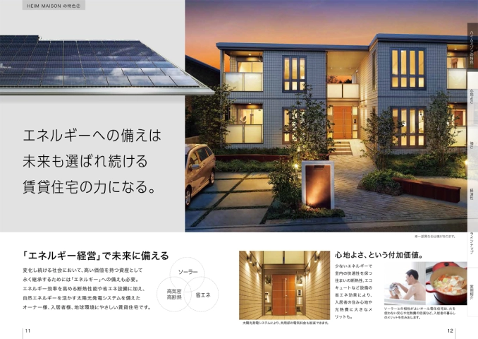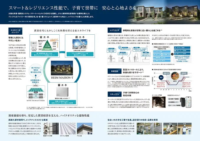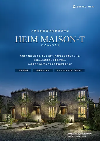 セキスイハイムが戸建住宅で培った「スマートハイム」技術を賃貸住宅ハイムメゾンに展開。賃貸に永く住み続けたいファミリー世帯に向けて、スマートハイムナビ(HEMS)による電力制御効率化で「電力をへらす」、太陽光発電システムで「電力をつくる」、蓄電池で「電力をためる」機能を装備。使い切らない電力は電力会社に売電し、省エネな暮らしを実現します。