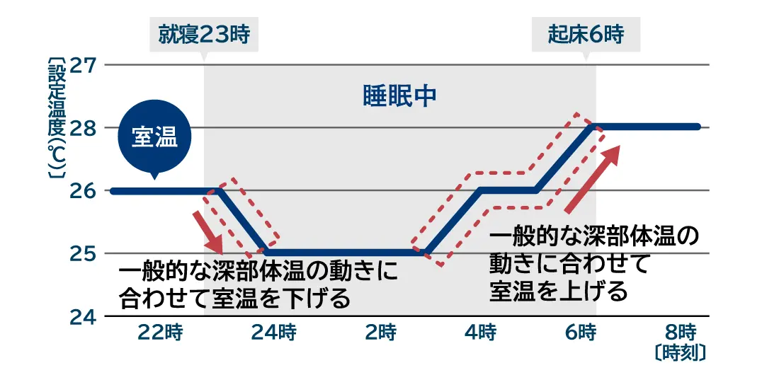 この製品は、自動的に眠りや体温を検知して室温を調整するわけではありません。室温が変化する時間は、お客様にて変更いただきます。外気条件により設定温度にならないことがあります。春や秋の中間期は、暑さ寒さが発生する可能性があります。その場合は、空調をOFFにするか設定温度を変更してください。また、この製品は室温を管理するものであって、居住者の深部体温に働きかけるものではありません。