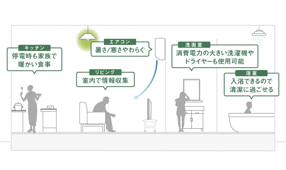 - ※停電時、蓄電池の残量がない場合は電力を使用できません。また使用できる範囲は、蓄電池や事前の設計により異なります。