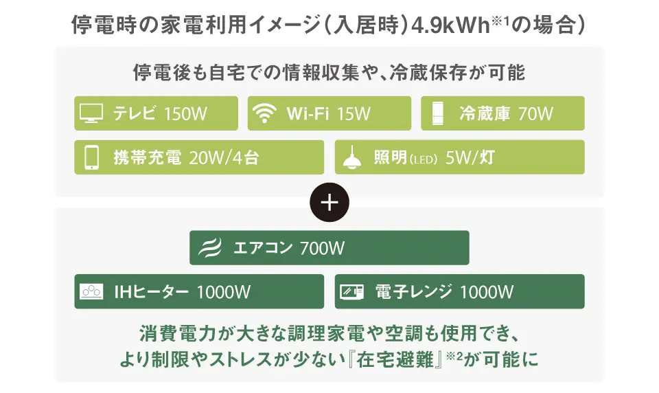 消費電力が大きい機器や起動時の電力が大きい機器を使用した場合は、蓄電池がシステム停止となる場合があります。また、センサーや調光機能を搭載した照明や家電の機種により動作しない場合があります。