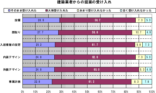 ■建築業者からの提案の受け入れ(現在オーナー) 住宅メーカーなど建築業者はアパート建築に際して様々な提案を行っていますが、どの項目も80%を超える人が建築業者からの提案を(そのまま受け入れた、大体受け入れた)としています。建築業者の提案をそのまま受け入れたのは、設備29%、間取り28%、入居者層の設定25%、内装デザイン25%、外観デザイン25%、事業計画で23%となっています。