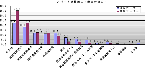 ■アパート管理への関わり方(現在オーナー) 入居者募集、修繕、清掃、クレーム対応、退出確認、リフォーム手配、家賃集金などの管理を100%外部委託しているのが半数強となっており、アパート管理は専門会社に任せる時代が進展しています。中でも入居者募集は6割が不動産業者に委託しています。 ■アパート経営を考えた理由 アパート経営を考えた最大の理由は第1位「収入増」以下「資産の有効利用」「老後の私的年金」と続いています。現行アパートオーナーで「収入増」を最大の理由にあげた人は22%ですが、潜在オーナーでは35%、「資産の有効活用」をあげた人が18%に対し22%、「老後の私的年金」は12%に対し12%とほぼ同じ比率となっています。潜在オーナーは現行オーナーに比べて収入増、資産の有効活用意識が強いようです。