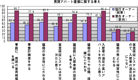 ■アパート建築に対する意識と行動 アパート建築に際して重視したこと(潜在オーナーは意向)は、「入居者の満足が高いアパートをつくろうと思う」「建物の安全性にこだわる」「周囲の家賃相場を調べる」「建築前に入居者層を設定する」「建物の間取りや仕様、設備にこだわる」など。