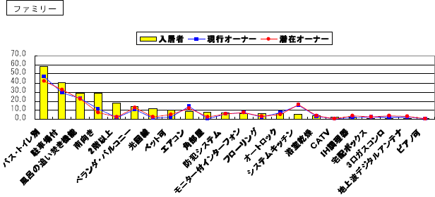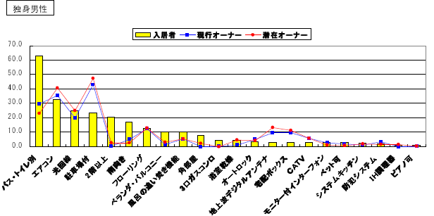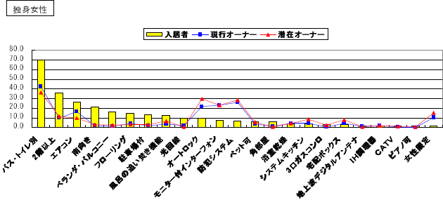 ■重視する条件はオーナーと入居者でギャップ アパートオーナーが想像する入居者の重視点と実際の入居者の重視点との間にはかなりの開きがあることもわかりました。入居者ニーズがオーナーの想像より高いものは、独身男性の「バス・トイレ別」「ベランダ・バルコニー」「2階以上」「南向き」「角部屋」。逆に低いのは「駐車場付」「地上デジタルアンテナ」など。独身女性については、「オートロック」「モニター付きインターフォン」「防犯セキュリティ」「女性限定」といった項目がオーナーの予想よりも低く、逆に高いのは「2階以上の要望」「バス・トイレ別」「エアコン」「フローリング」といった基本的な設備もオーナーの想像よりも入居者のニーズの方が高くなっています。ファミリータイプでは、「追い炊き機能」「南向き」「駐車場」に対する要望がオーナーの予想よりも大きく、「エアコン」「システムキッチン」はオーナーの予想を下回っています。