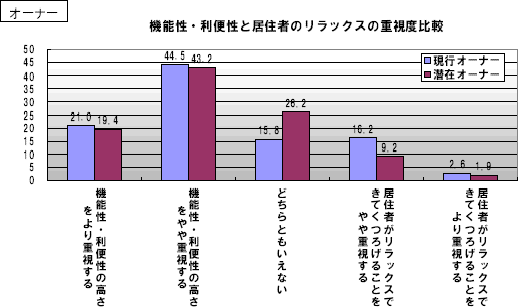 ■機能性・利便性と居住者のリラックスの重視度に大きなギャップ 「あなたにとって理想の家とは、何が満たされている家か」の質問に対する自由回答を「機能性・利便性」と「リラックス」に分けてみると、オーナーは「機能性・利便性」を重視しているのに対し、居住者は「リラックス」できることを求めていることがわかりました。