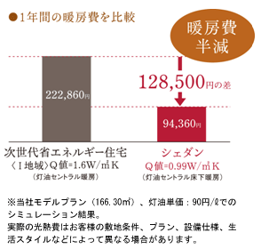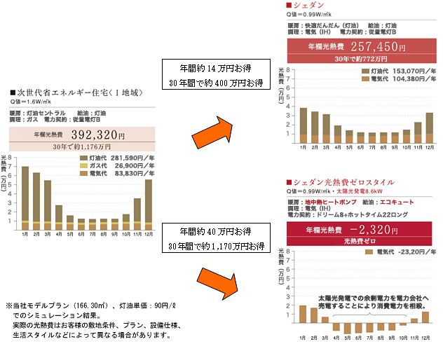 2.省エネ+創エネで光熱費ゼロを実現・標準仕様はQ値=0.99W/㎡Kで次世代省エネルギー住宅に比べ暖房費を半減させることが可能。 ・「光熱費ゼロスタイル」は標準仕様に「地中熱ヒートポンプ」「太陽光発電システム」、「エコキュート」を装備することで光熱費ゼロを実現します。 (166.30㎡の『シェダン』モデルプランでは8.6kwの太陽光発電システムで光熱費ゼロが実現します。)