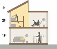 「スキップアップピット」は「ハイムbj」の象徴といえる「オブリックルーフ」(片流れ大屋根)を有効活用し、傾斜天井の下を2層に分けた小屋裏空間です。利用度の低かった一般的な小屋裏と比べ、2階床部分は収納として活用、0.5階分上がる新空間は収納だけでなくギャラリースペースとして利用するなど、住まい手の自由な発想で活用できるようにしました。さらに、建物の中に吹き抜けやロフトなどとともに立体的にひろがる空間づくりも可能となり、多様化する団塊ジュニア世代のライフスタイルに対応しやすくなりました。