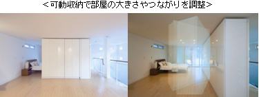 (【子ども独自の発達促進】に寄与) 子どもは成長に伴って、興味の対象や生活習慣も大きく変化させていきます。そんな 子どもの「自立」と「自律」のためには、成長段階に応じてそれぞれ適切な間取りが存在します。したがって間取りが固定されてしまうような制約の多い構造ではなく、可変的で柔軟性のある構造が理想的。「GAIASS」によって内部空間は元々増改築に適した構造となっていますが、さらに「可動収納」を採用し、日常的な可変からライフステージの変化にまで、ほぼ大掛かりな工事をすることなく容易に対応できるように配慮しています。例えばライフスタイルの変化への対応として、