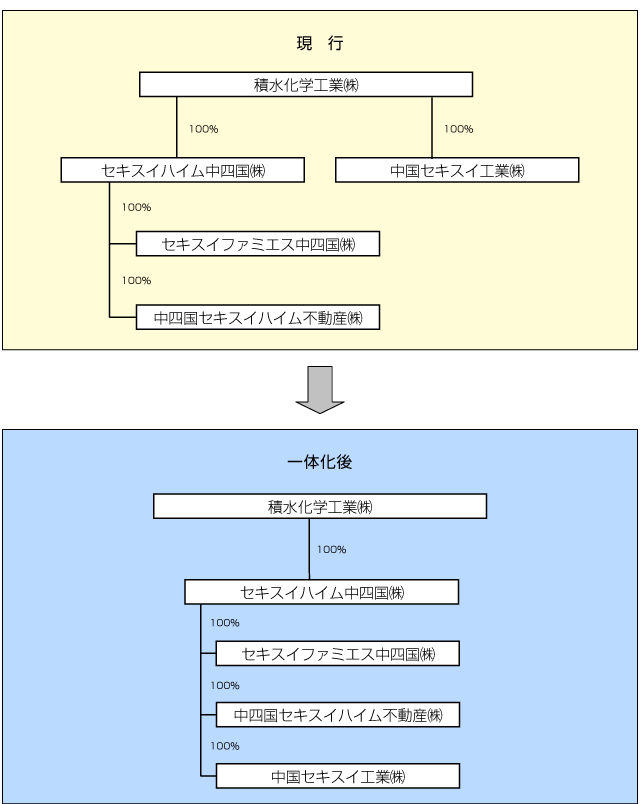2.エリアニーズマーケティングの強化これまでも中四国エリアにおいては、太陽光発電システム搭載住宅を積極的に進めるなど気象条件やエリア特性に対応した住まいづくりに取り組んできましたが、生販一体化により、これまで以上にエリアニーズ、お客様の声が反映できる商品開発を行います。 3.効率化の成果を商品仕様・価格・サービスに反映ユニット工法をベースに、工場稼働率を高め、高品質(安心・快適・環境にやさしい)で、コストパフォーマンスの高い住まいの提供がさらに前進します。生販一体化による効率化をエリア向けにカスタマイズした商品の仕様・販売価格・サービスに反映させることで、競争力を高め、シェアアップを図ります。当面目標とするのは中四国で5%の戸建シェアへの引き上げです。 <生販一体化後の資本関係>