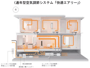 「快適エアリー」は、エネルギー効率の高いヒートポンプ式の採用と深夜電力を活用するタイマー運転制御機能で、年じゅう、家じゅう「あったか+さわやか」な快適室内空間を省エネ・省コストで実現する独自の新空調システムです。