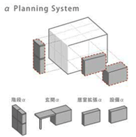 「αプランニングシステム」は、従来のユニットで空間を構成する発想を進化させ、ボックスラーメンユニットの強靭な躯体を利用しながら、ユニット躯体に付帯空間をジョイントできるサブシステムです。
