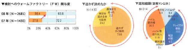 通年型空気調節システム「快適エアリー」は、好評の「あったかハイム」の次世代型快適設備として開発。ユニット工法ならではの床下大空間にヒートポンプ式空調と、熱交換式第1種換気システムを併設することで、床下空間も含めた温湿度、空気環境を季節に応じて調節します。冬は暖気を床下にも噴出すため、1階全体が「温度差の少ない暖かさ」と「足元からじんわりあったか」はそのままに、冷房・除湿機能の追加で熱ごもりの少ない「夏のさわやか」への要望も実現できるようになりました。 最も活用度の高い1階LDKではメイン空調としてしっかり冷暖房・除湿。2階を含めた他のスペースは余力を分配するサポート冷暖房として機能します。個別のエアコンを必要に応じて最小限運転することで快適に過ごせ、特に冬場はヒートショック等の原因となる温度差の軽減を図ります。 「快適エアリー」は、エネルギー効率の高いヒートポンプ式の採用と深夜電力を活用するタイマー運転制御機能で、年じゅう、家じゅう「あったか+さわやか」な快適室内空間を省エネ・省コストで実現する独自の新空調システムです。 ■省エネ性と経済性を見える化する「快得生活シミュレーション」を展開今回の『もっと!もっと!あったかハイムキャンペーン』では、「快適エアリー」や「ウォームファクトリー」とPVの併用のメリットを建築前にお客様に詳しくご理解いただくため、新たな光熱費シミュレーション「快得生活シミュレーション」を実施します。 PVについては2020年に現状の20倍とする設置目標が掲げられております。また、太陽光発電の新たな買取制度が11月から始まります。当社では業界ナンバーワンのPV累積搭載実績に基づくハード・ソフト両面の強みがあり、従来から建てる前の光熱費シミュレーションを実施してきました。今回、さらにこの新たな買取制度にいち早く対応し、光熱費シミュレーションを改訂したのが「快得生活シミュレーション」です。全国に広がるPVを採用されたお客様の光熱費データと、これから家作りを検討されるお客様の光熱費とを比較したり、セキスイハイムの快適設備「快適エアリー」や「ウォームファクトリー」を設置した場合の比較もシミュレーション可能です。今後、快適性と光熱費削減に関して新光熱費シミュレーション「快得生活シミュレーション」を積極的に行う計画です。 ■高い満足度で差別化に貢献する「ウォームファクトリー」「ウォームファクトリー」は2005年10月の導入以来、既に20,000組を超えるご入居者にご採用いただいています。2008年度ご入居者への「ウォームファクトリー」に関する調査によると、「ウォームファクトリー」が「ハイムの検討のきっかけになった」という回答が36.4%となり、採用にあたっては73.6%のお客様が「迷わずに採用を決めた」と回答、ハイム訴求の柱となっていることが判りました。 「ウォームファクトリー」を初めて知ったのは、「展示場」が30.5%となり、「検討にあたって何を参考にしたか」という問いにも、「設置された展示場」が63.6%と、「営業マンのアドバイス」75.5%に次ぐ高い割合でした。展示場などでの体感により関心がアップしたこともわかっています。