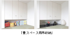 また、可変設備の提案も充実。使用頻度の高いおもちゃや育児用品を、吊収納の下のスペースに収められるようにし、子どもの成長に伴い「床の間」にもなる「畳スペース用吊収納」なども用意しています。 |