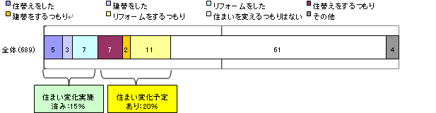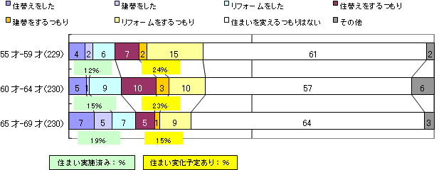 老後のことを考えて住まい変化の実施および計画予定を、年令別に見ると、55-59歳、60-64歳で住まい変化を予定している方がそれぞれ24%、23%。65歳以上では予定ありの方が15%となっています。