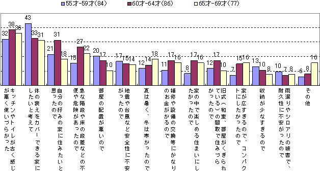 これを年齢別でみると、55-59歳では「体の衰えをカバーできる」が43%と他の年令層に比べて非常にポイントが高くなっています。60-64歳では自分の好みの家にしたい、60歳以上では補修や設備、家の中で楽しめる、家が広すぎるのでコンパクトにしたいが高くなっています。